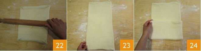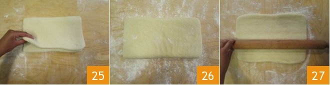 and cover with the other edge 25: the first fold is ready. Cover with plastic wrap and let rest for at least 30 minutes in the refrigerator. Take the dough and place it on the floured work surface again 26; roll it out in the direction of the folds 27