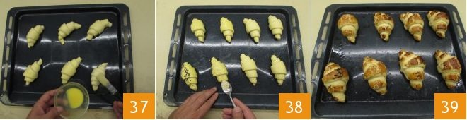 Brush the surface with a beaten egg yolk 37 and decorate some croissants with white sesame seeds and others with black sesame seeds 38. Let them rise for an hour and a half at room temperature. Bake in a preheated ventilated oven at 392°F for 30 minutes, checking the cooking without opening the oven until they are golden brown. Remove from the oven 39 and let cool before cutting and filling your salty croissants.