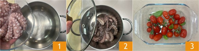 Place the octopus, already cleaned, in a pot 1, cover with a lid 2, and cook dry, over low heat, for 40 minutes. Meanwhile, place the cherry tomatoes in a baking dish, add some basil leaves and a few sprigs of marjoram 3.