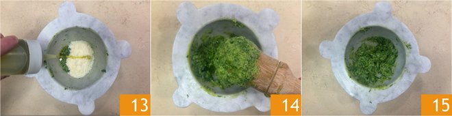 Add the olive oil 13 and pound 14 incorporating all the basil gradually until you obtain a fresh basil pesto 15.
