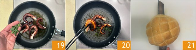 Add the marjoram 19 and toast the octopus until it becomes crispy 20. It's time to assemble the sandwich, so cut it in half 21.