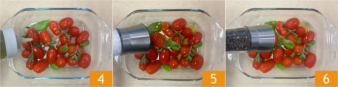 Drizzle with a little olive oil 4, season with salt 5 and pepper 6. Bake in a static oven at 374°F for an hour.