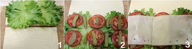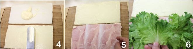 Now start assembling your sandwiches. Spread mayonnaise on two slices of bread 4, then take one and lay on top, in order: the sliced ham 5, the lettuce leaves 6,