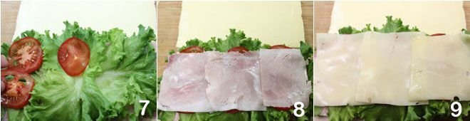 the tomato slices 7, more ham 8, the Edamer cheese slices 9