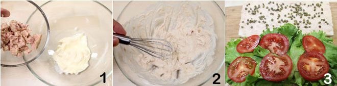 To make the tuna sandwiches, start by preparing the cream: drain 1.8 oz (50 g) of tuna from the total amount and flake it with a fork. Put the mayonnaise in a bowl, then add the tuna 1 and mix everything with a whisk; it should result in a creamy mixture 2. At this point, take two slices of bread, spread them with the cream, and add a handful of capers to each. On one of the two slices, lay the lettuce leaves and tomato slices 3.