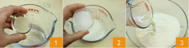 To prepare Santa Claus bread, start by dissolving the yeast in lukewarm water 1, while in lukewarm milk add sugar 2 and salt, and stir to combine the ingredients. Take a large bowl and pour in the sifted flour, then add the water with dissolved yeast 3,