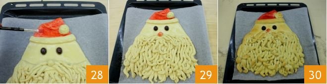 With a brush, color the hat 28 and the nose 29 red, then bake Santa Claus bread in a preheated static oven at 356°F for 35 minutes (if using a fan oven, at 320°F for about 25-30 minutes). Once cooked, remove it from the oven 30, let it cool slightly, and enjoy it to celebrate Christmas!