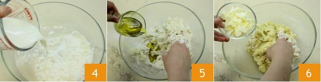 then also pour in the milk with sugar and salt 4. Begin kneading, gradually adding the olive oil 5 in a thin stream. Once the oil is incorporated, add the softened butter in small pieces 6 a little at a time, adding more when the previous amount is incorporated.