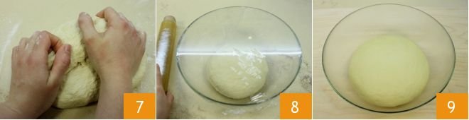 Knead everything in the bowl, then transfer the dough to a lightly floured surface. Work it vigorously 7 until you get a soft, smooth, and homogeneous dough. Form a ball, place it in a bowl, cover with plastic wrap 8, and let it rise at room temperature for a couple of hours (or until it doubles in volume) 9.