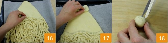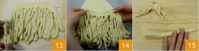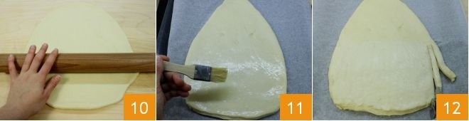 After the necessary time, take the dough again, divide it into two parts, one about 2 lbs and the other 1 lb. Roll out the larger one 10 into a triangular shape 14 inches in height, with a bottom width of about 2.5 inches and a base of 9 inches, with rounded corners representing Santa Claus's head and hat. Place the dough triangle on a baking sheet lined with parchment paper and brush with water 11. Then cut strips about 0.4 inches thick along the base of the triangle 12.