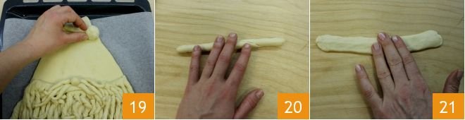 Position the pom-pom 19 and then focus on the base of the hat with the remaining dough, making a small log 20 to slightly flatten 21.