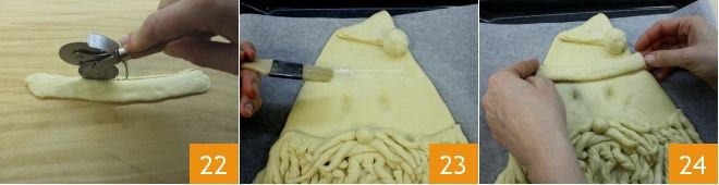 Finish the edge with a serrated cutter 22, brush Santa Claus's forehead with water 23 and place the base of the hat 24.