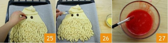 Create the eyes with two black olives 25 and brush all of Santa Claus bread with beaten egg 26. In the remaining beaten egg, add a few drops of red food coloring until you get the desired color 27.