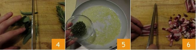 While the onion is frying, chop the sage and rosemary (leave a few needles whole to decorate the final dish if you prefer) 4, sauté them with the onion 5. Slice the bacon and cut it into strips 6,