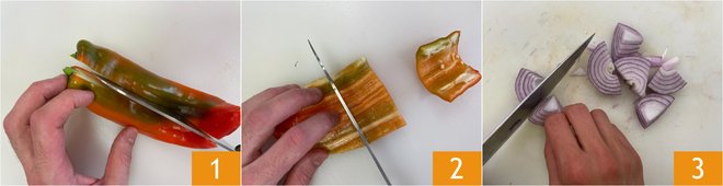 To prepare Sardinian gnocchetti with bell pepper cream, cherry tomatoes and shrimps, first clean the bell peppers: cut them in half lengthwise 1 and remove seeds and inner filaments, then chop them into large pieces 2. Peel the onions and roughly chop them as well 3.
