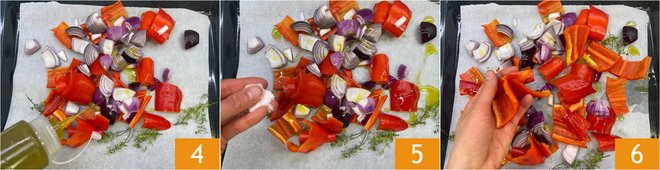 Transfer the bell peppers and onions to a baking sheet lined with parchment paper, then add sprigs of thyme and season with oil 4 and salt 5. Mix well with your hands to distribute the seasoning evenly 6 and bake in a static oven at 428°F for about 20-25 minutes.