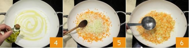 Put the extra virgin olive oil in a pan 4, heat it, then add the chopped onion, carrots, and celery 5. Stir to brown the vegetables on all sides. After 5 minutes, deglaze with broth (or boiling water) 6 and let it cook for another 10 minutes.