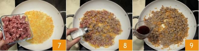 Add the sausage 7, season with salt 8, and deglaze with red wine 9.