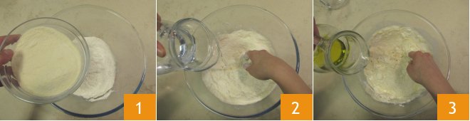 To prepare the Sardinian ricotta ravioli, first take care of the fresh pasta: in a large bowl, pour the all-purpose flour and semolina flour 1, add the water 2 and oil 3 gradually, mixing with your hands.