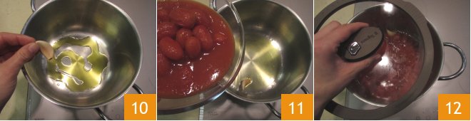 Prepare the tomato sauce by sautéing the garlic with its skin in a pan with a drizzle of oil 10. Add the peeled tomatoes with their juice 11, adjust the salt, and cook covered 12 over low heat for at least 20 minutes.