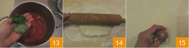 After this time, remove the lid and continue cooking for the remaining 10 minutes over high heat. Turn off the heat and add fresh basil 13. Roll out the pasta to a thickness of about 1/16 inch with a rolling pin 14, then cut with the ravioli mold 15.