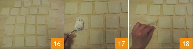 With the indicated quantities, by re-kneading the leftover pasta, you will get about 48 squares 16, place a teaspoon of filling in the center 17 and place another square on top 18.