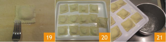 Press the edges to make them adhere and finish with the prongs of a fork 19. Place the ravioli on trays dusted with flour 20. Place a pot filled with salted water on the stove, and when it reaches a boil, cook the ravioli for about 2-3 minutes 21.