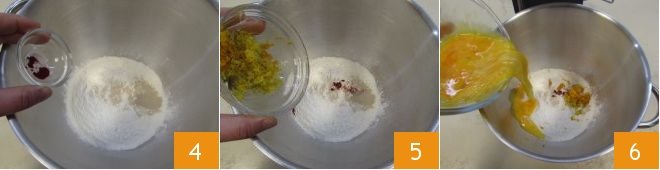 Then add the powdered saffron 4, the grated lemon and orange zest 5, and the slightly beaten eggs 6.