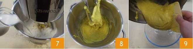 Turn on the stand mixer equipped with the paddle attachment and slowly pour in the milk 7. Work the dough at medium speed for about 5-6 minutes. The dough will be very hydrated and sticky 8. At this point, pour the dough into a bowl, using a dough scraper to detach it from the sides 9.