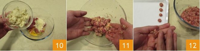 along with the lightly beaten egg, the Parmesan cheese, and the well-squeezed bread crumbs 10, season with salt and pepper, and add some chopped parsley, kneading to obtain a homogeneous mixture 11. At this point, you can form the meatballs: take about 4 grams of mixture and mold it between your hands to form small spheres 12. By doing so, you will get 100 meatballs.