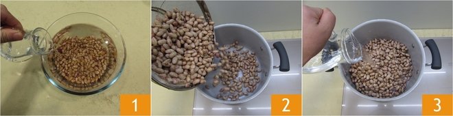 To prepare sausage and beans, start by soaking the borlotti beans for 8 hours 1. The next day, drain the beans, rinse them, and then place them in a large pot 2, cover with cold water 3, and bring to a boil. As soon as the water reaches temperature, lower the heat to a simmer and cook for about 50 minutes; salt only at the end of cooking.