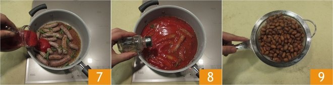Add the rosemary sprigs and tomato puree 7. Season with salt and pepper 8 and cook over low heat for 35-40 minutes. After the indicated time, drain the cooked beans 9.