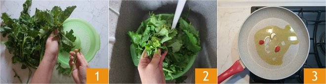 To prepare sausage and friarielli, start by cleaning the latter: set aside the stems with the smaller leaves and the inflorescences, ensuring there are no yellowed parts on the larger leaves, which should be removed. Strip the healthy leaves from the stems by holding the stem with one hand and pulling up the part with the leaves 1. Wash the friarielli thoroughly under running water 2. In a pan, add some oil, garlic, and halved chili pepper 3,