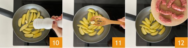 Place the potato wedges in a bowl with water and dissolved baking soda 4; let them soak for 15 minutes. Meanwhile, cut the sausage into pieces each about 2-3 inches long 5 and set aside. After the time has passed, drain and dry the potatoes thoroughly 6.