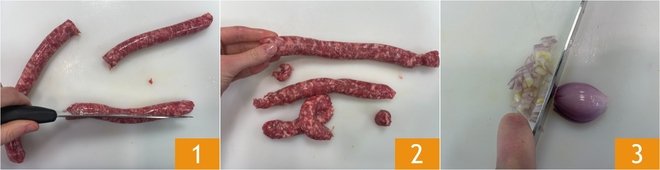 To prepare the sausage and saffron risotto, first prepare the meat broth following our recipe and keep it warm. Score the sausages 1 and remove the casing, then break them into pieces by hand 2 or crush them with the blade of a knife. Clean and finely chop the shallot 3.