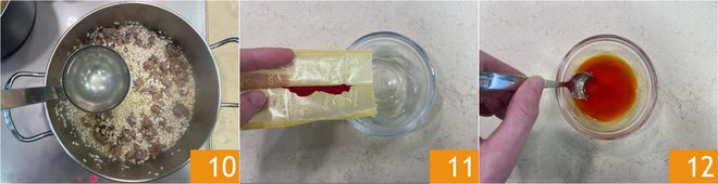When the alcohol has completely evaporated, start moistening the rice with the broth, adding a ladle at a time as soon as the liquid dries out 10. Meanwhile, dissolve the saffron in a small bowl with a little warm broth 11 and mix well to dissolve it 12.
