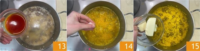 When there are about 5 minutes left for the rice to finish cooking, add the saffron 13. Mix well and season with salt 14. Once the rice is cooked, turn off the heat and stir in the cold butter 15.