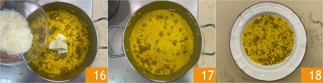 Also add the grated Parmesan cheese 16 and mix everything together 17. Plate and finish with a grind of pepper. Your sausage and saffron risotto is ready to be served 18!