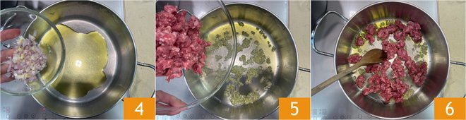 Heat a drizzle of oil in a saucepan, then add the shallot 4 and let it wither over medium-low heat for a few minutes. Add the sausage 5 and brown it for 4-5 minutes, stirring often 6.