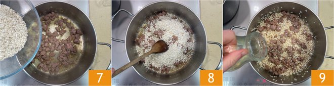 At this point, add the rice 7 and toast it until the grains feel hot to the touch 8, then deglaze with the white wine 9.