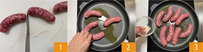 To prepare pan-fried sausage, first remove the string that ties them together 1 and keep the casing so they retain their shape. Heat a drizzle of oil in a large nonstick skillet, then lay in the sausages 2 and add the garlic cloves 3.