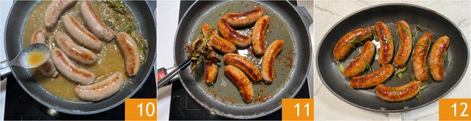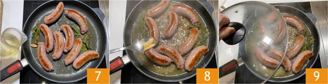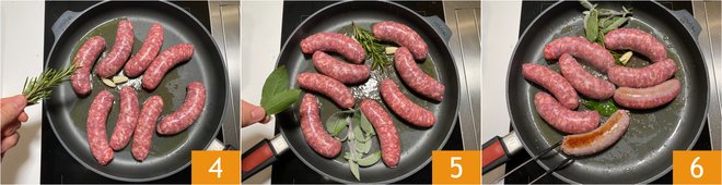 Season with rosemary 4, sage and bay leaf 5. Brown the sausages over medium-high heat until golden, then turn them to the other side 6; it will take about 6 minutes in total.