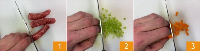 To prepare the sausage with red wine and polenta, first cut the sausage into pieces about 2 inches long 1. Finely chop the celery 2 and the carrot 3.