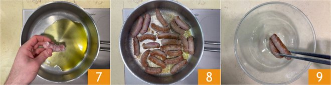 Heat the oil in a pot, then add the sausage 7 and brown it well 8 over medium-high heat. Remove the sausage from the pot and transfer it to a bowl 9.