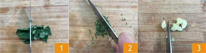 To prepare sausages in the air fryer, first finely chop the sage 1, rosemary 2, thyme, and garlic 3.