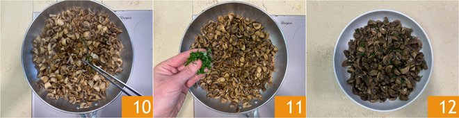Remove the parsley stems as well 10, add the chopped fresh parsley 11, and plate. Your sautéed champignon mushrooms are ready to be served 12.