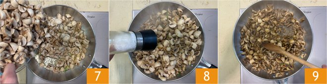 Add the mushrooms 7 and brown them over high heat. Season with salt 8 and pepper. Lower the heat and cook for 10 minutes, stirring occasionally 9.