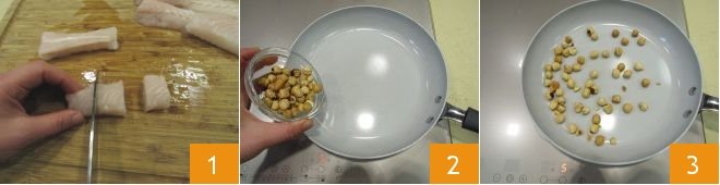 To prepare the sauteed hake bites, take the hake fillets and cut each fillet into 3 pieces, obtaining bite-sized pieces 1. Once you have cut all the fish, set it aside in the refrigerator while you prepare the seasoning. In a pan, pour the hazelnuts 2 and toast them for 5-6 minutes over low heat 3. Once toasted, set them aside and let them cool.