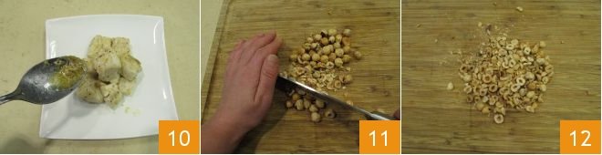 Place the hake bites on a serving plate, drizzling them with the cooking juices 10. At this point, take the toasted hazelnuts, now cooled, and chop them coarsely with a knife (11-12).