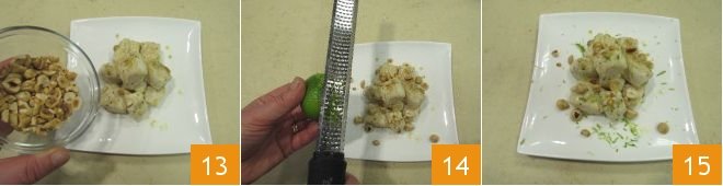Sprinkle the chopped hazelnuts over the hake bites 13, finish with a final grating of lime zest 14, and serve 15: your sauteed hake bites are ready to be served!